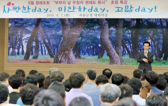 |  | | | ⓒ (주)영남도민일보 | | [영남도민일보] 김진규 기자 = 세계 최초의 국가기념일인 부부의 날을 주창한 권재도(54) 목사가 하동군청 공무원을 대상으로 특강을 했다.