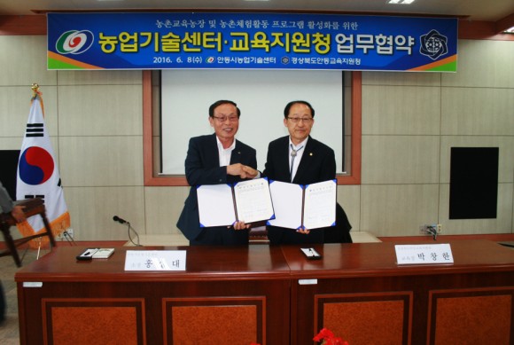 6월 8일 안동시농업기술센터 대회의실에서 관계자 30여명이 참석한 가운데 업무 협약을 맺고, 농업․농촌의 가치 확산과 이해증진은 물론 농촌 활력을 도모하기 위해 학교교육과정과 연계한 체험교육프로그램 운영, 농촌교육농장 활성화 등의 지속적인 참여활동을 지원하고자 상호 협력하기로 한다.