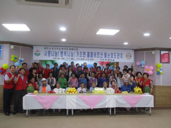 이날, 행사는 가조면 남여자원봉사회 회원 30여명이, 우리 지역 어르신들의 건강을 기원하고, 이웃간의 정을 나누자는 취지로 추진하게 되었으며, 팔순을 맞이한 어르신들을 직접 모셔와 손수 음식을 준비하고, 생일상을 차려 대접했다.