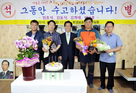 |  | | | ⓒ (주)영남도민일보 | | [영남도민일보] 김옥순 기자 = 문경시(시장 고윤환)은6월24일 오전11시 고윤환 문경시장과 직원,환경미화원 동료80여명이 참석한 가운데 환경미화원 임효석 등4명에 대한 명예로운 정년퇴임식이 열렸다. 이날 퇴임하는 임효석,김동식,김희태,이규홍 환경미화원은20여년간 공직에 근무하면서 투철한 봉사정신으로 맡은 바 직무를 성실히 수행하고 특히, 깨끗한 환경 조성에 기여한 공이 크므로 감사함을 담은 공로패를 전달 받았다. 고윤환 시장은“항상 건강하시고 앞날에도 제2의 멋진 인생을 맞이하시길 바란다”고 말했다. 임효석,김동식,김희태,이규홍 환경미화원님!명예로운 정년퇴임을 축하드리며 그 동안 고생 많으셨습니다.