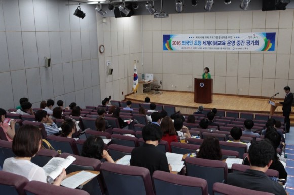 |  | | | ⓒ (주)영남도민일보 | | [영남도민일보] 권기한 기자 = 경북교육청(교육감 이영우)은 2016년 7월 6일 안동대학교 어학원 1층 시청각실에서 도내 초, 중, 고 세계 이해 교육 프로그램 운영 담당 교사와 5개 협력 대학 관계자 및 도교육청 관계자가 참석한 가운데 “외국인 초청 세계이해교육” 중간 평가회를 개최하였다.
