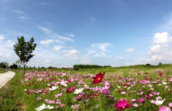 |  | | | ⓒ (주)영남도민일보 | | [영남도민일보] 김진규 기자 = 22일, 함안강나루오토캠핑장 자전거도로에 형형색색의 코스모스가 여름햇살 속에 만개해 낙동강변의 시원한 바람과 함께 한낮의 더위를 잠시나마 잊게 하고 있다.