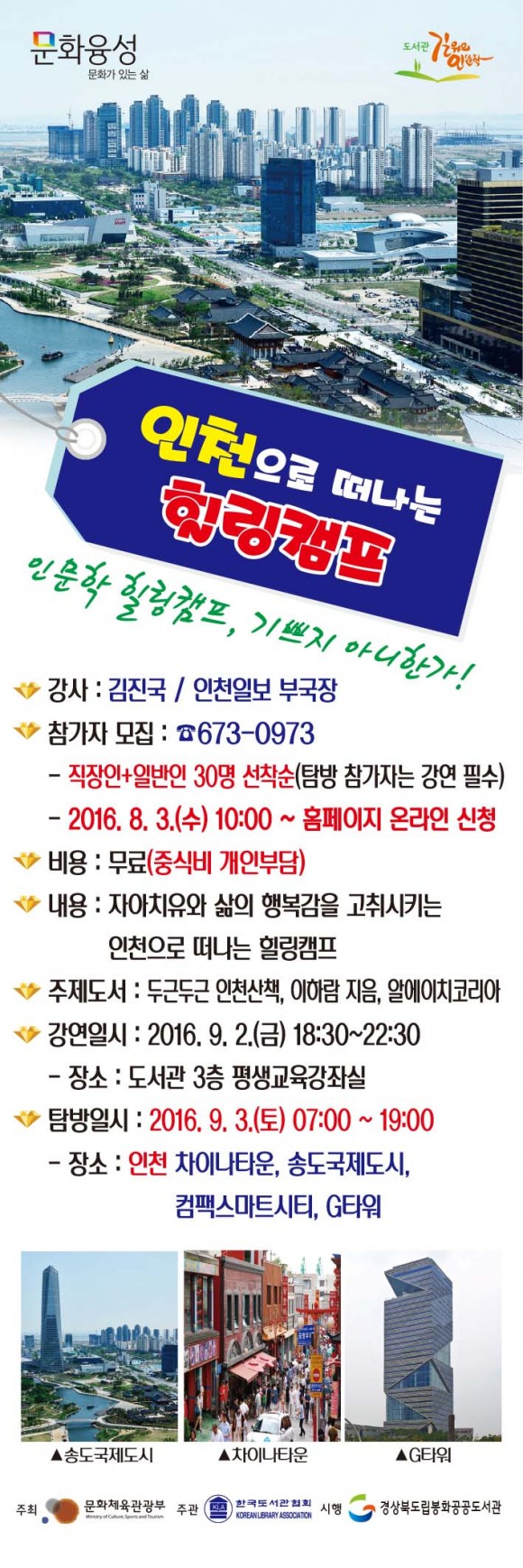 <인천으로 떠나는 힐링캠프>는 9월 2일(금) 김진국 인천일보 부국장이 도서관에서 4시간 강연하며, 9월 3일(토) 인천 차이나타운과 송도국제도시를 탐방한다. 1983년 인천항이 개항된 이후 중국인들이 모여 살면서 중국의 독특한 문화가 형성되고 한국 속의 이국적인 문화가 고스란히 남아있는 차이나타운에서 인천의 과거와 현재를 본다. 컴팩스마트시티, 센트럴시티, G타워를 둘러보며 미래로 부상하는 송도국제도시에서 자아치유와 삶의 진정한 행복감 고취로 힐링타임을 만끽한다. 인천의 과거ㆍ현재ㆍ미래의 모습을 한눈에 살펴보고, 변화하는 인천의 모습을 오감으로 느껴본다.