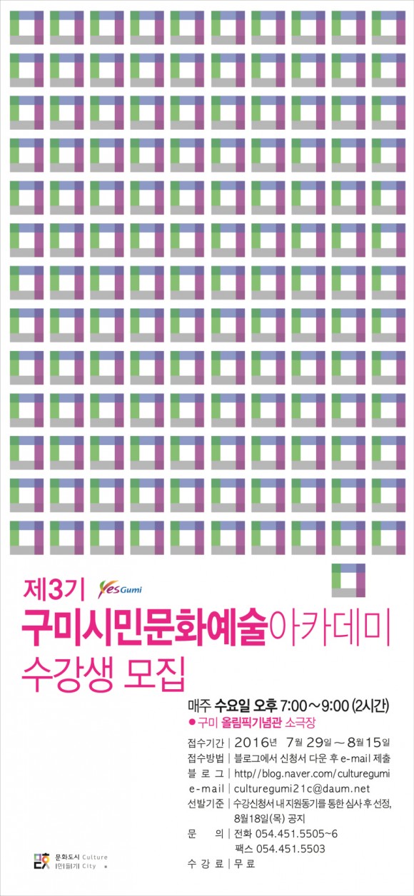 |  | | | ⓒ (주)영남도민일보 | | [영남도민일보] 안충도 기자 = 구미시 문화특화지역조성사업 추진협의회(위원장 심정규, 이하 구미문화도시만들기)가 주관하는 구미시민문화예술아카데미(원장 조명래)가 제3기 수강생을 모집한다.