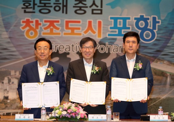 이강덕 포항시장은 11일 포항시청 대회의실에서 김관용 경북도지사, 권오준 포스코 회장과 함께 타이타늄 산업 육성을 위해 양해각서(MOU)를 체결 했다.
