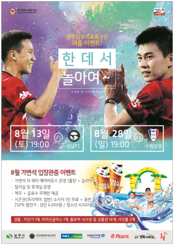 |  | | | ⓒ (주)영남도민일보 | | [영남도민일보] 김옥순 기자 = 상주상무프로축구단(대표이사 백만흠)이 8월 13일(토) 저녁 7시에 열리는 성남FC전과 28일(일) 저녁 7시 수원과의 홈경기에서 무더위를 이기기 위한 여름 이벤트 ‘한데서 놀아여~’를 공개했다.