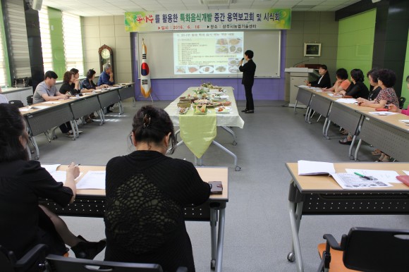 보고회에서 리아트푸드연구소 김정숙 소장은 지난 번 중간용역보고회 시식평가 결과를 바탕으로 보완된 한식 10코스 메뉴(뽕잎과 콩을 활용한 죽 외 10종)와 양식 5코스 메뉴(뽕잎감자스프 외 4종)를 전시, 발표하고, 아울러 닭 한 마리 뽕잎칼국수 외 9종의 단품메뉴 시식회 및 평가의 시간을 가졌다.