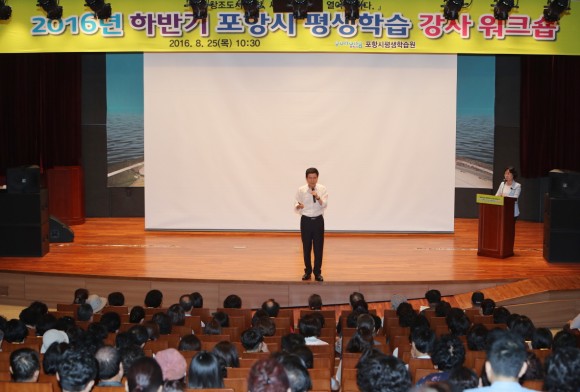 |  | | | ⓒ (주)영남도민일보 | | [영남도민일보] 정문용 기자 = 25일 오전 평생학습원 2층 대강당에서 평생학습원에 등록된 강사와 읍면동 평생학습 강사 등 400명이 워크숍을 가지고 있는 가운데, 이강덕 포항시장이 「창조도시 포항, 새로운 미래를 열어갑니다!」를 주제로 평생학습 강사들과 소통의 시간을 가졌다.
