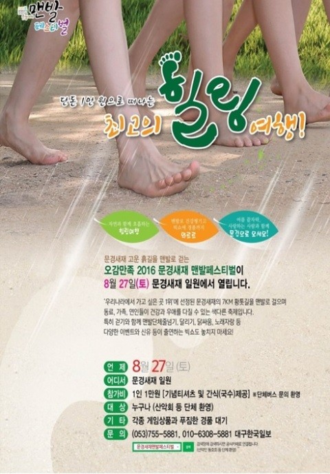 |  | | | ⓒ (주)영남도민일보 | | [영남도민일보] 김옥순 기자 = 경상북도와 문경시가 후원하고 대구한국일보가 주최하는 「2016 오감만足문경새재 맨발페스티벌」이 전국 최고의 황토 옛길인 문경새재에서 2016. 8. 27(토)개최된다.