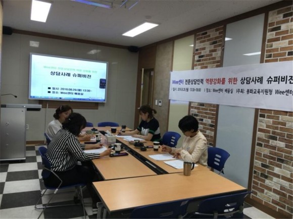 |  | | | ⓒ (주)영남도민일보 | | [영남도민일보] 권기한 기자 = 봉화교육지원청(교육장 김종길)Wee센터는 지난 8월 29일(월) 위기사례에 대한 대처능력을 증진, 상담역량 강화를 도모하기 위한 목적으로 2016년 상반기 상담사례에 대한 슈퍼비전을 진행하였다.