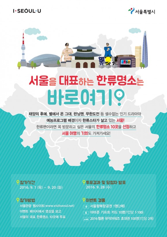 |  | | | ⓒ (주)영남도민일보 | | [영남도민일보] 이남희 기자 = 서울시가 9월 1일(목)부터 20일(화)까지 서울을 대표하는 10대 한류명소 선정을 위한 온라인 투표 이벤트를 개최한다.
