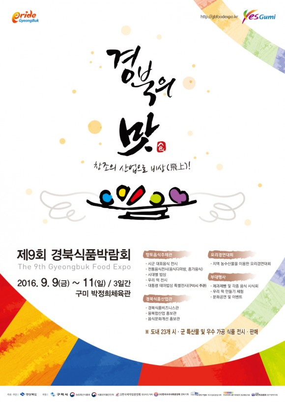 |  | | | ⓒ (주)영남도민일보 | | [영남도민일보] 안충도 기자 = 경상북도(지사 김관용)가 주최하고, 구미시(시장 남유진)와 공동 주관하는 ‘제9회 경북식품박람회’ 가 오는 9월 9일부터 11일까지 3일간 구미 박정희체육관에서 개최된다.