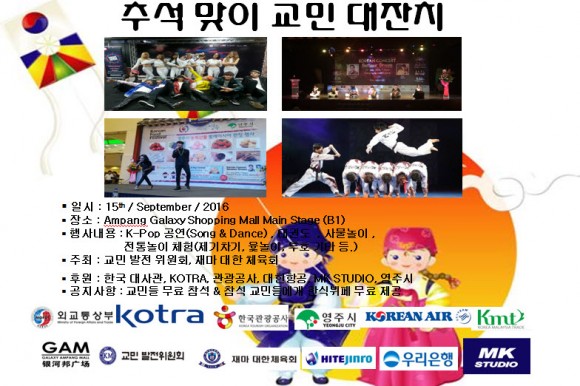 추석맞이 교민대잔치는 쿠알라룸푸르 교민발전위원회(회장 박호남), 재마대한체육회(부회장 김주열), MK Studio(대표 유승복)사가 공동 추최하고 영주시가 후원하는 행사로 각계각층의 교민인사 등 320여명이 참석해 성황을 이뤘다.