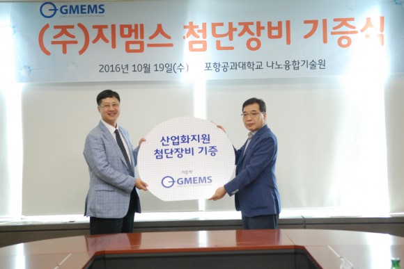 |  | | | ⓒ (주)영남도민일보 | | [영남도민일보] 정문용 기자 = 포스텍 나노융합기술원과 (주)지멤스가 19일 나노융합기술원에서 MEMS(미세전자기계시스템) 분야 첨단장비 수증 및 설치완료 기념 기증식을 개최했다.