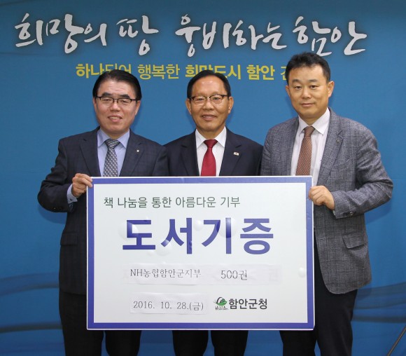 |  | | | ⓒ (주)영남도민일보 | | [영남도민일보] 김진규 기자 = 함안군(군수 차정섭)은 NH농협 함안군지부(지부장 이성환) 직원 일동이 도서 500권을 군에 기증해 28일 10시, 군수실에서 기증식을 가졌다.