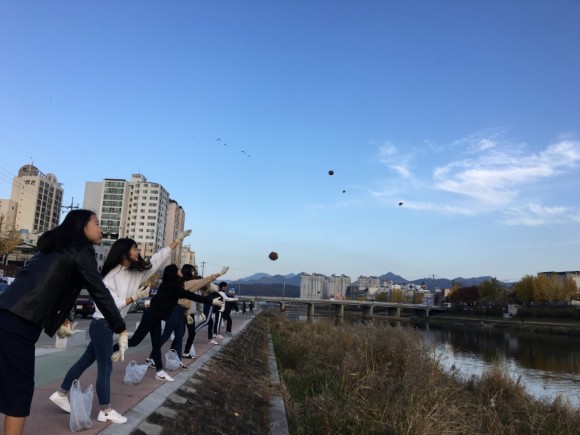 ‘EM(Effective Micro-organisms) 흙공’은 수십 종의 유용한 미생물 효소 발효액과 황토를 반죽해 야구공 크기로 만든 흙덩어리로, 누리봄 동아리 청소년들이 직접 반죽해 3주 동안 발효시켜 제조한 것이다.