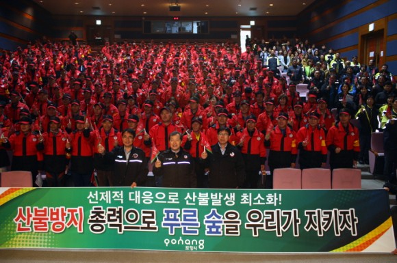 산불에 대한 심각성을 널리 알리고 산불방지에 대한 마음을 다잡기 위해 마련된 이날 행사에서 산불감시원 대표자를 비롯한 400여명은 ‘우리의 다짐 선서’로 내년 5월까지 단 한건의 산불도 발생되지 않도록 결의를 다지는 한편 안전보건공단으로부터 산불방지와 관련한 안전교육을 받았다. 발대식에 앞서 포항시는 내년 5월까지 ‘산불 제로화’ 위해 담수용량 3,400리터 대형헬기를 지난 1일부터 운영하고 있으며, 14일부터 산불전문진화대 28명, 산불감시원 239명을 452개소의 산불취약지역에 배치했다.
