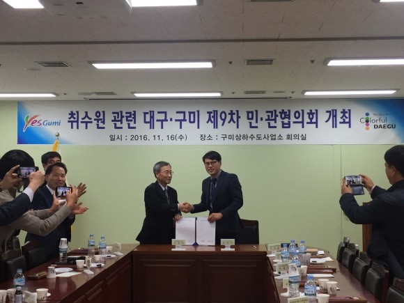 |  | | | ⓒ (주)영남도민일보 | | [영남도민일보] 안충도 기자 = 2016.11. 16일 취수원 관련 대구․구미 민․관협의회 제9차 회의가 구미시 상하수도사업소 3층 회의실에서 개최되었다.