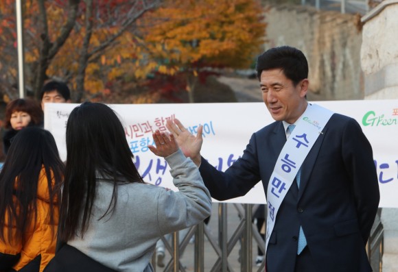 이 시장은 시험장에 들어서는 수험생들과 일일이 하이파이브를 하며 “지난 3년 동안 이번 수능시험을 위해 최선을 다해 준비해 온 만큼 실력을 100% 발휘해 모두가 원하는 좋은 결과가 있기를 바란다.”고 응원의 메시지를 전달했다.