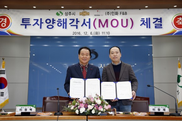 |  | | | ⓒ (주)영남도민일보 | | [영남도민일보] 김옥순 기자 = 2016. 12. 06.(화) 오전 11시 상주시(시장 이정백) 와 ㈜인화F&B(대표 이창재)간에 만두류 및 농산물 가공식품 생산공장 건립을 위한 투자양해각서(MOU)를 체결하였다.