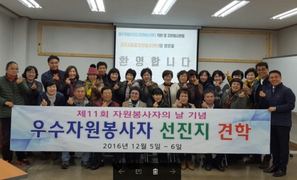 |  | | | ⓒ (주)영남도민일보 | | [영남도민일보] 정문용 기자 = 제주특별자치도자원봉사센터(센터장 이유근)에서는 5일 경주에서 열린 ‘2016 대한민국 자원봉사자대회’ 참가 후 우수자원봉사자 선진지 견학을 위해 (사)경주시종합자원봉사센터(이사장 이용래)를 찾았다.