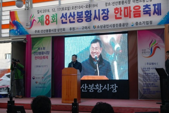 김중권 부시장은 지역경제 발전과 서민경제를 위해 묵묵히 본연의 임무를 수행해 온 상인들을 격려하며 “이번 축제가 선산봉황시장을 젊은시장! 활력이 넘치는 시장! 이라는 명성을 떨칠 수 있고 다시 찾아오고 싶은 시장이라는 이미지를 심어줄 수 있는 계기가 되길 바란다.”고 전하였다.