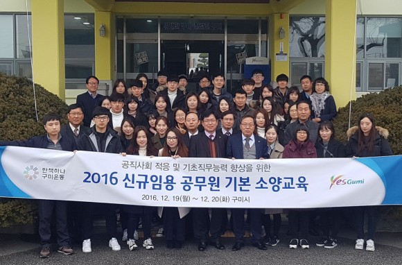 |  | | | ⓒ (주)영남도민일보 | | [영남도민일보] 안충도 기자 = 구미시(시장 남유진)는 12월 19일부터 20일까지 1박 2일 동안 구미시선산청소년수련관(구미시 선산읍 소재)에서 2016년도 신규임용 공무원 41명을 대상으로 공직사회 적응 및 기초직무능력 향상을 위한 「2016년 신규임용 공무원 기본 소양교육」을 실시하였다.