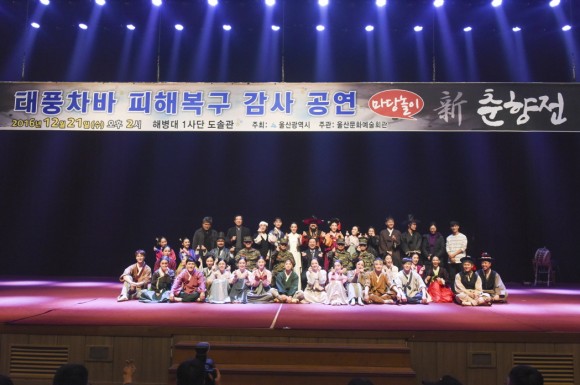 |  | | | ⓒ (주)영남도민일보 | | [영남도민일보] 정문용 기자 = 지난 10월 울산지역을 휩쓸고 간 태풍 차바 피해에 신속한 피해복구지원에 나섰던 포항 해병대 제1사단(사단장 최창룡)장병들의 노고에 대한 감사의 표시로 울산시립예술단에서 포항1사단을 찾아 ‘신춘향전’ 공연을 펼쳤다.