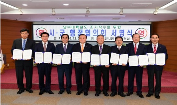 |  | | | ⓒ (주)영남도민일보 | | [영남도민일보] 홍인환 기자 = 남부내륙철도(김천∼거제)의 조기건설을 위해 노선경유 경남․북 자치단체장이 26일 김천시청에서 “남부내륙철도 시·군 행정협의회” 서명식을 개최하였으며, 본격적인 협의회 출범과 함께 현재 “한국개발연구원(KDI)”에서 진행 중인 예비타당성조사의 신속한 마무리를 촉구하는 대정부 성명서를 발표했다.