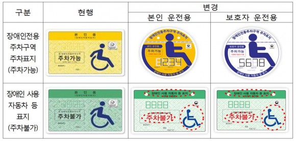 표지가 교체되면 장애인 주차구역에 주차 가능한 자동차는 동그라미 표지를, 주차불가 자동차는 사각형 표지를 부착하게 돼 구분이 명확해지게 된다. 그동안 사망 등 편법으로 장애인 표지를 반납하지 않고 사용하는 주차가능 표지의 부정사용을 방지할 수 있을 것으로 보인다.