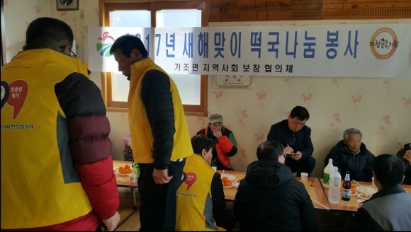 |  | | | ⓒ (주)영남도민일보 | | [영남도민일보] 김병한 기자 = 거창군 가조면(면장 이해용)은 지난 10일부터 11일까지 지역사회보장협의체 주관으로 ‘정유년 새해맞이 경로당 떡국 나눔’ 행사를 진행했다.