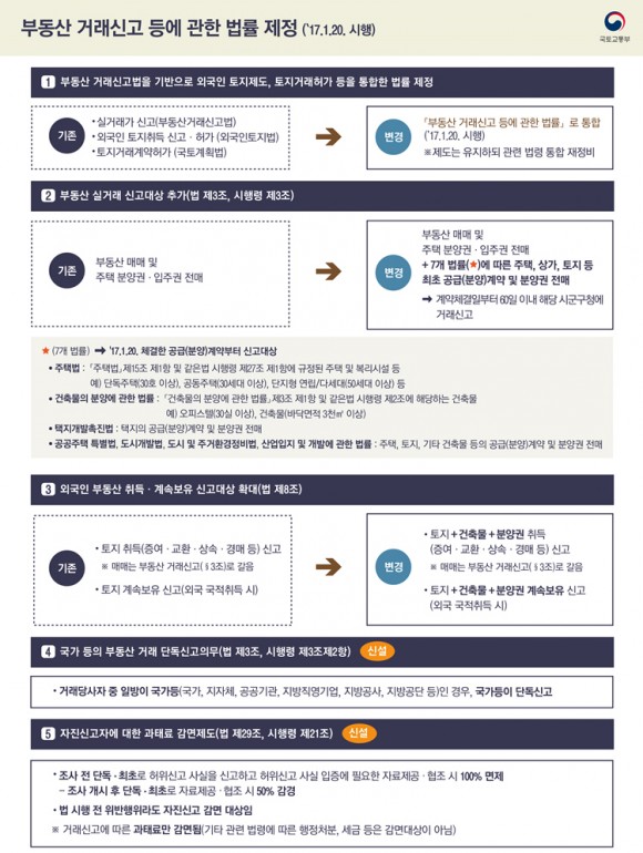 이번 부동산 거래신고 등에 관한 법률은 기존 부동산 거래신고 대상(주택, 토지 등 매매, 주택분양권 전매)에 부동산의 최초 분양계약 및 토지·상가의 분양권 전매가 신고대상으로 추가되어 부동산의 분양계약 및 분양권 전매 시 계약일로부터 60일 이내에 관할 관청에 반드시 신고해야 한다.