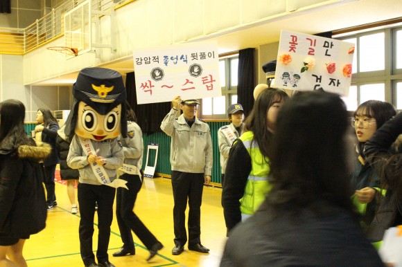 |  | | | ⓒ (주)영남도민일보 | | [영남도민일보] 최교열 기자 = 김해중부경찰서(서장 김상구)는, 초·중·고교의 졸업식이 집중되어 있는 2월 졸업기간(2.2~2.17)을 「강압적 졸업식 뒤풀이 싹!스탑 기간」으로 정하고 지난 9일 김해여중 졸업식장에서 민·학·경 합동 캠페인 및 순찰 활동을 실시했다. 졸업식 전에는 건전한 졸업문화 정착을 위한 「꽃길만 걷자」레드카펫 이벤트를 실시해 졸업생들의 새 출발을 경찰관들이 응원하면서, 다른 한 편에서는 “싹! 스탑” 문구가 적힌 양말을 학생들에게 배부하는 강압적 졸업식 뒤풀이 예방을 캠페인을 했다. 함께 참여한 김해교육지원청 관계자는 “이색적인 예방 캠페인으로 학생들의 관심도가 올라가면서 학생들 스스로 다시 생각해 볼 수 있는 기회가 된 것 같아 경찰에게 감사하다”며 긍정적인 반응을 보였다.