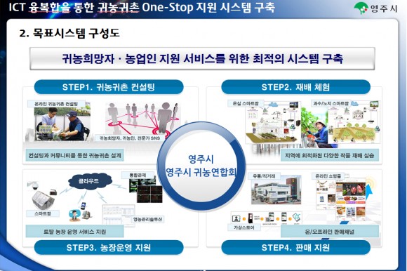 이번에 선정된 ‘영주시 ICT 융복합을 통한 귀농․귀촌 One-Stop 지원 시스템 구축사업’은 귀농인을 대상으로 효율적인 스마트팜 및 농장 통합관제 시스템 구축, 온라인 서비스 개발, 영농관리․운영 솔루션 도입, 가상스토어 시스템 개발 등을 통한 경영컨설팅과 교육을 실시하는 사업이다.