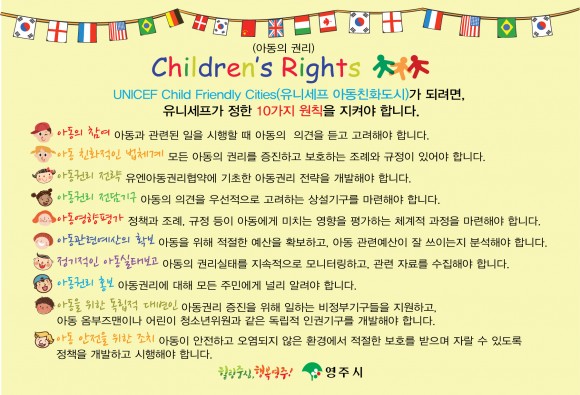 시는 아동이 주체가 되는 아동친화도시를 만들어 가기 위해 유니세프가 정한 ‘아동의 권리 10가지 원칙’을 알리고 아동 참여를 유도하기 위한 어린이와 청소년의 자유로운 의사를 전달하는 창구로 엽서를 제작해 배부할 계획이라고 밝혔다.
