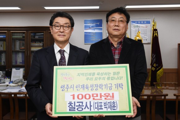 |  | | | ⓒ (주)영남도민일보 | | [영남도민일보] 김창기 기자 = 영주시는 ㈜칠공사 박재훈 대표가 영주시인재육성장학회에 장학금 1백만원을 기탁했다고 밝혔다.