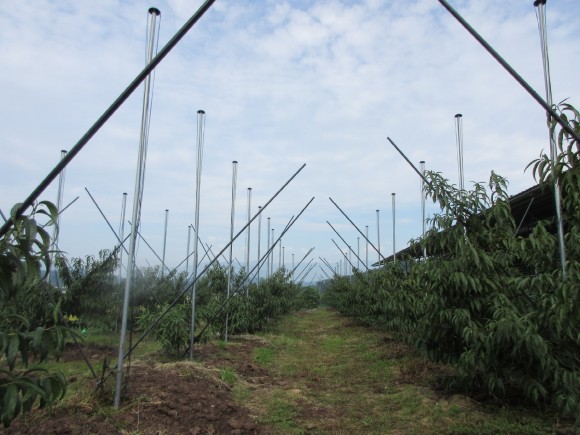특히, 복숭아 우산식 지주시설은 제초작업에 소요되는 노동력을 절감시키고 여름철 복숭아 수형관리 기술을 체계화시켜 과실 품질 향상과 고품질 안정생산 기술 확립에 큰 효과를 보이고 있어 복숭아재배농가로부터 좋은 반응을 얻고 있다.