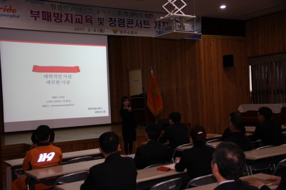 이날 청렴콘서트는 박혜담 대표(혜담‘S 감성스피치)를 강사로 초빙해 기존 교육 형태를 벗어나 청렴 아이콘을 활용한 콘서트 형식으로 진행됐으며, 직원들의 공직자 청렴 공감대 형성을 위해 친절·서비스 정신을 기를 수 있는 방법에 대한 열띤 강의로 호응을 얻었다.