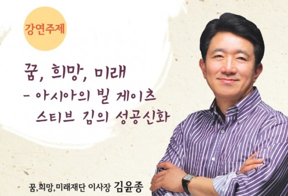 김윤종 대표는 이번 강연에서 ‘아시아의 빌 게이츠 스티브 김의 행복을 주도하는 삶‘을 주제로 자신의 성공스토리를 비롯해, 행복한 삶을 위한 7가지 차별화 전략으로 자아발견, 다양한 경험, 명확한 비전, 자신감, 호감도, 소통능력, 실행력 및 습관화를 제시했다.