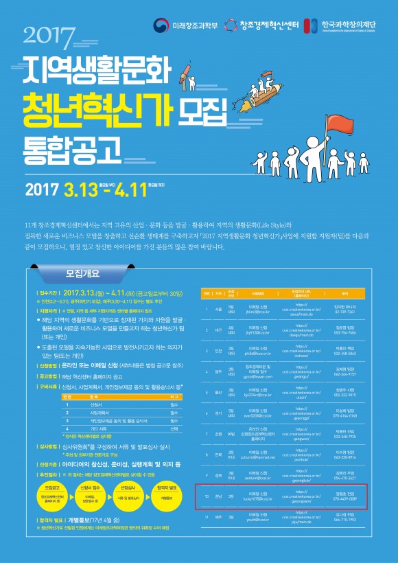 경남창조경제혁신센터(센터장 최상기)는 지역의 특색있는 생활문화를 기반으로 비즈니스모델을 발굴하고, 지역에서 사업화(제품개발, 관광서비스등)할수 있도록 지원하는 “2017년 지역생활문화 청년혁신가사업” 을 4월11일까지 모집한다.