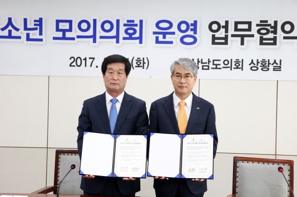 청소년들이 의회의 역할과 기능을 이해하고 민주주의 의식을 함양하기 위해 마련한 이날 협약에서 도의회는 의장선거, 전자투표를 통한 의안처리과정 체험 등 청소년 모의의회 운영을 맡고, 경남도교육청은 참여학교 신청․접수, 의안 준비 등 청소년 모의의회 운영 지원을 상호 협력하기로 했다.