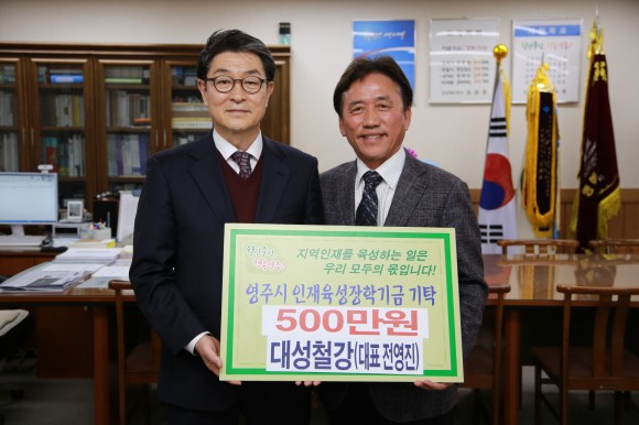 |  | | | ⓒ (주)영남도민일보 | | [영남도민일보] 김창기 기자 = 영주시는 지난 23일 대성철강(대표 전영진)에서 영주시인재육성장학회에 장학금 5백만원을 기탁했다고 밝혔다.