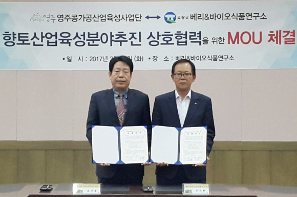 |  | | | ⓒ (주)영남도민일보 | | [영남도민일보] 김창기 기자 = 영주시가 향토 산업으로 추진하고 있는 영주콩가공산업육성사업단이 지역 농식품산업 발전을 위해 전북 고창군 베리&바이오 식품연구소와 업무협약을 맺었다.