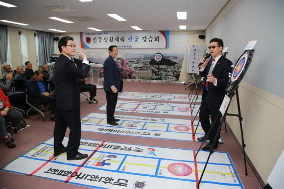 한궁(韓弓) 우리나라 궁도와 민속놀이 투호의 장점을 이용한 운동으로 어르신 생활체육의 대표 종목이다. 양손을 사용해 몸의 균형 및 유연성을 기르는데 도움을 주는 운동으로 날씨의 영향을 받지 않아 실내 어느 장소에서든지 연습이 가능해 꾸준한 운동으로 노년층의 건강유지가 가능한 것이 장점이다.
