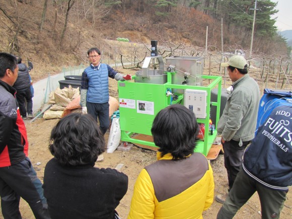 이번에 보급된 황토유황제조기는 무가열식 제조기로 석회유황합제와 달리 유황을 끓이지 않기 때문에 간편하고 안전하게 제조하여 사용할 수 있다.