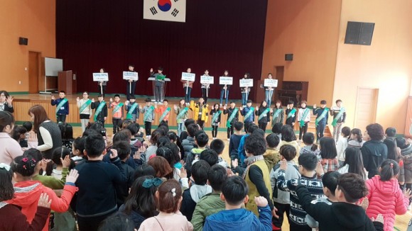 학생회 전교회장인 강대웅 학생은 학교폭력예방도우미 친구들과 함께 우리 학교가 언어폭력과 따돌림이 없는 행복한 학교가 되기 위해 앞장 설 것을 다짐하는 의미 있는 시간이 되었다고 말하였다.