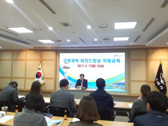 |  | | | ⓒ (주)영남도민일보 | | [영남도민일보] 안충도 기자 = 구미시(시장 남유진)는 4. 17(월) 시청 3층 상황실에서 규제개혁 업무담당자 80여명을 대상으로 ‘규제개혁 마인드 향상 직원 교육’을 실시하였다.