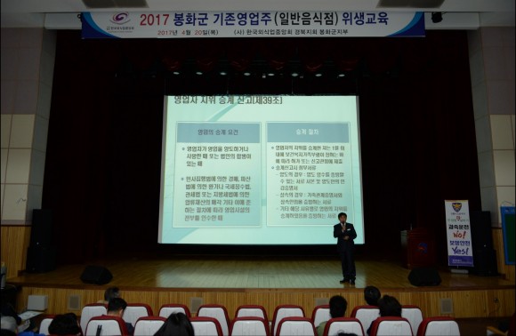 |  | | | ⓒ (주)영남도민일보 | | [영남도민일보] 고기훈 기자 = 한국외식업중앙회 경상북도지회 봉화군지부(지부장 구본수)에서는 4월20일(목) 오후 2시부터 오후 5시까지 봉화군 청소년센터 공연장에서 일반음식점 영업자 490여명이 참석한 가운데 위생교육을 실시했다.