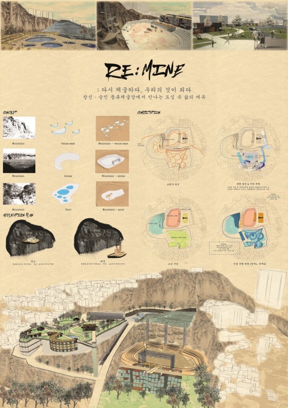 공간디자인 부문 최우수작인 “RE-MINE”은 대상지의 역사와 자연환경을 활용하여 새로운 문화적 장소를 만들려는 의도가 돋보였으며 기존지형을 변화시키지 않고 동양화적 접근으로 잘 표현한 작품이라는 평가를 받았다.