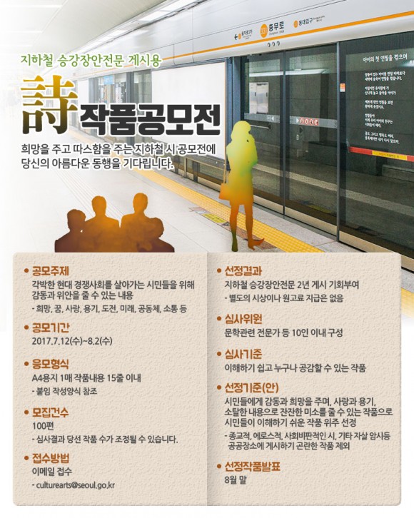 서울시는 7월 12일(수)부터 8월 2일(수)까지 지하철 승강장 안전문 게시용 시민 시(詩) 작품 100편을 공모한다. 지하철을 기다리는 잠깐 동안 시민들에게 따뜻한 위로와 희망을 안겨 줄 시민 시 작품 100편을 선정하여 지하철 1~9호선, 분당선 총 299개 역 승강장 안전문에 게시할 계획이다.